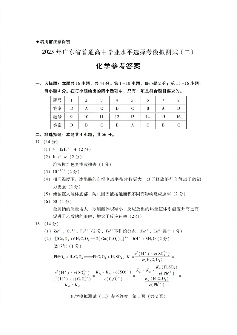 广东省2025年普通高等学校招生全国统一考试模拟测试 化学答案.pdf