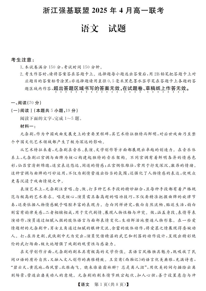 浙江强基联盟2025年高一第二学期4月联考 语文.pdf