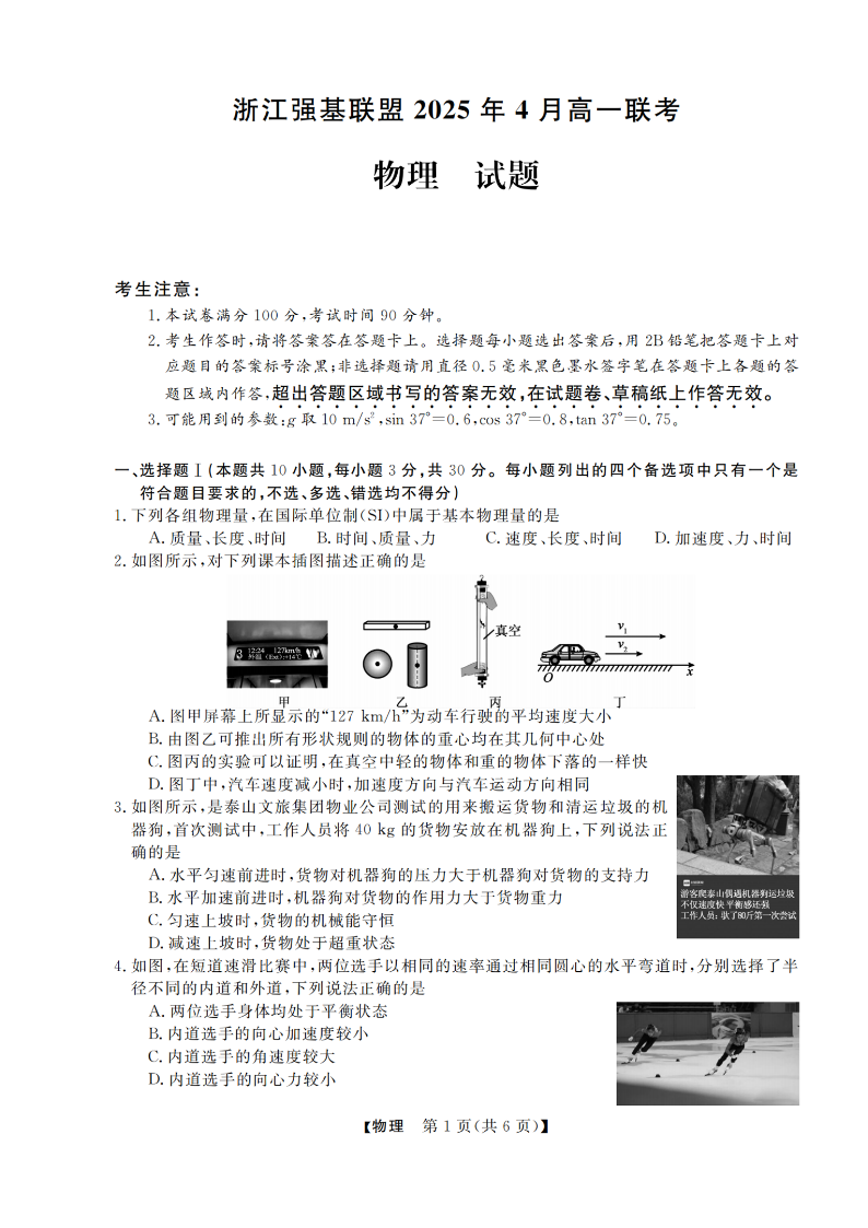 浙江强基联盟2025年高一第二学期4月联考 物理.pdf