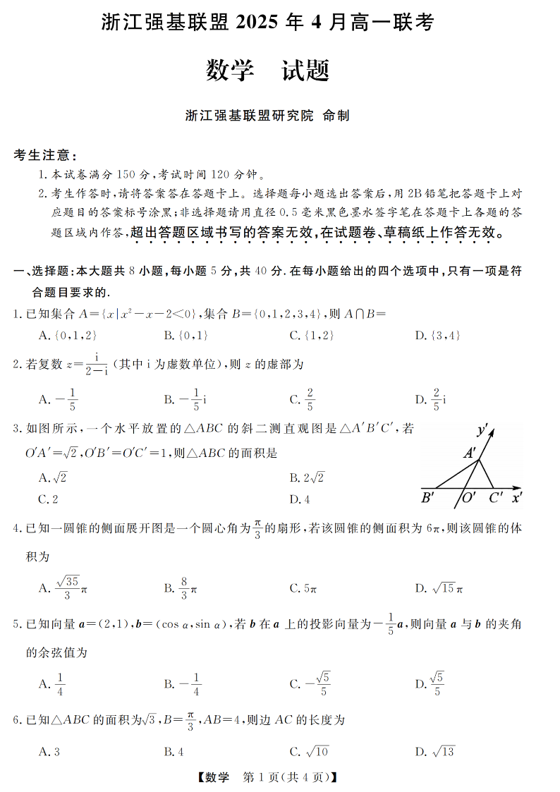 浙江强基联盟2025年高一第二学期4月联考 数学.pdf