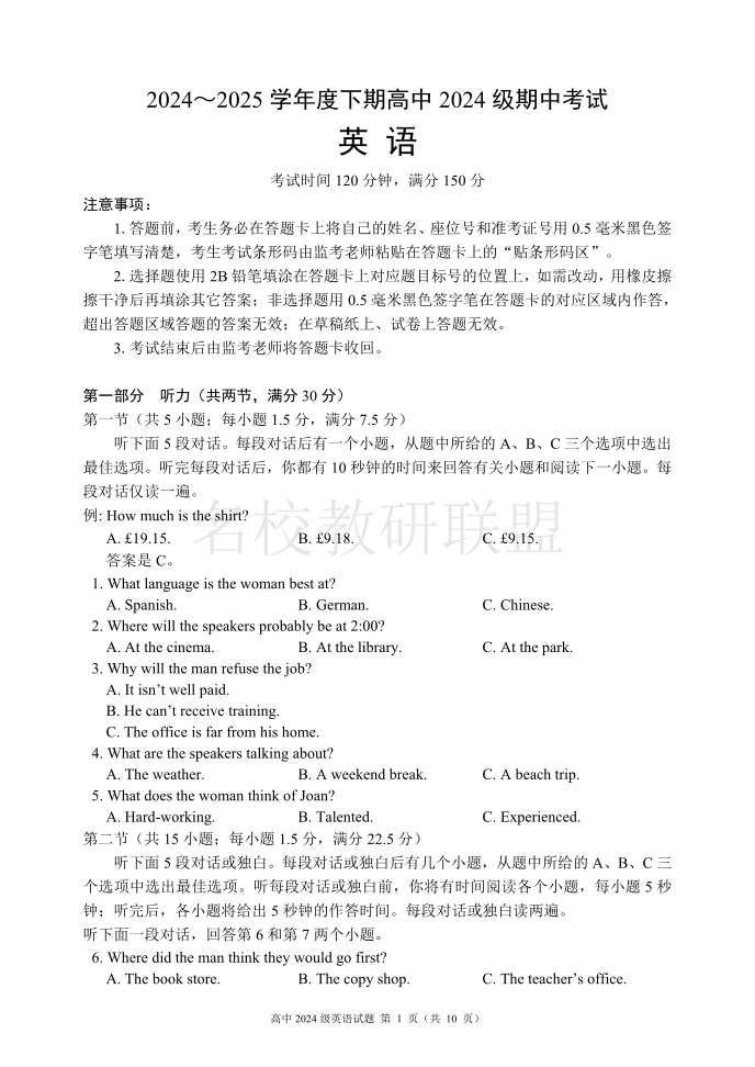 成都市蓉城名校联盟2024-2025学年高一下学期期中考试 英语.pdf