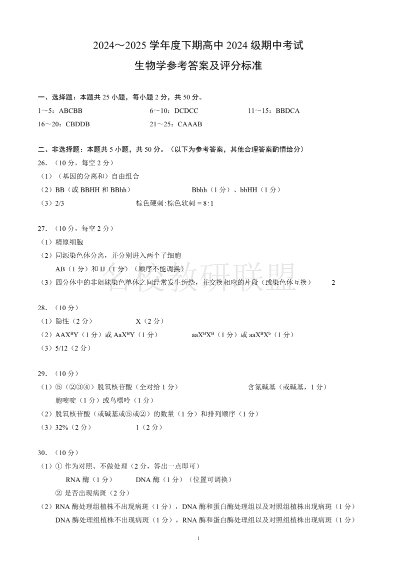 成都市蓉城名校联盟2024-2025学年高一下学期期中考试 生物答案.pdf