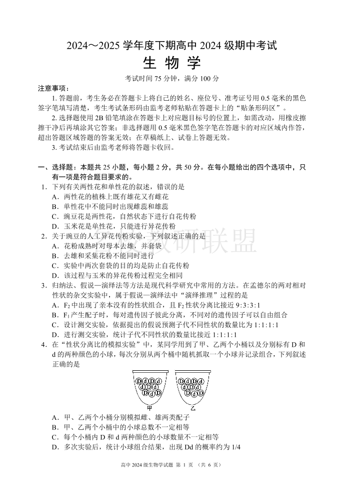 成都市蓉城名校联盟2024-2025学年高一下学期期中考试 生物.pdf