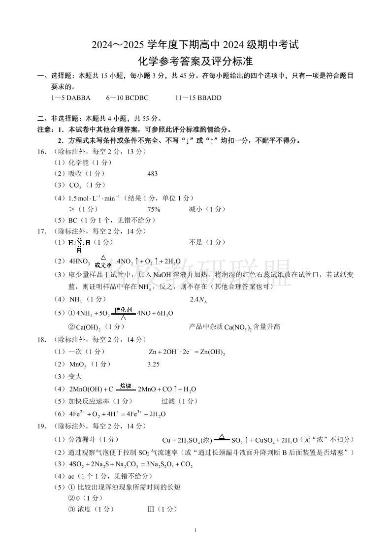 成都市蓉城名校联盟2024-2025学年高一下学期期中考试 化学答案.pdf
