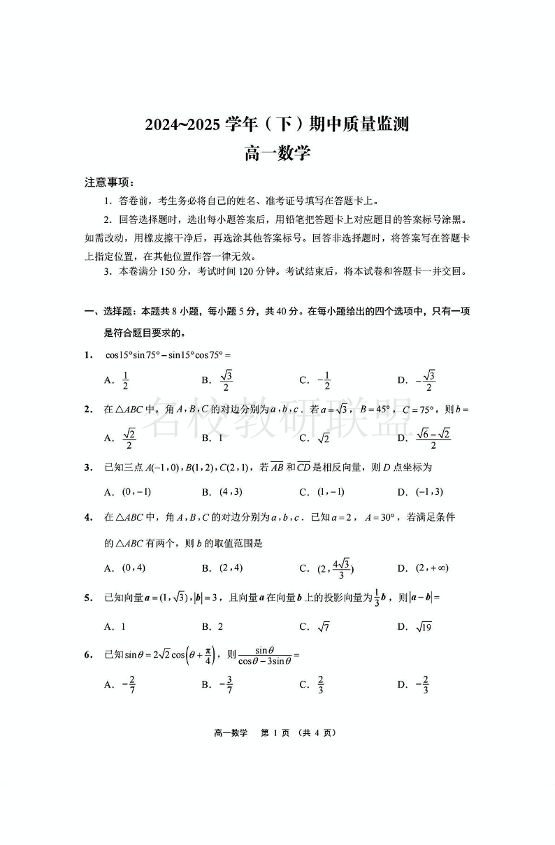 江苏省南通市2024-2025学年高一下学期期中考试 数学(含答案).pdf