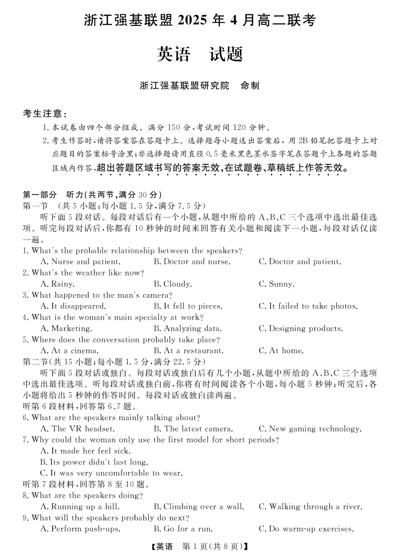 浙江强基联盟2025年高二第二学期4月联考 英语.pdf