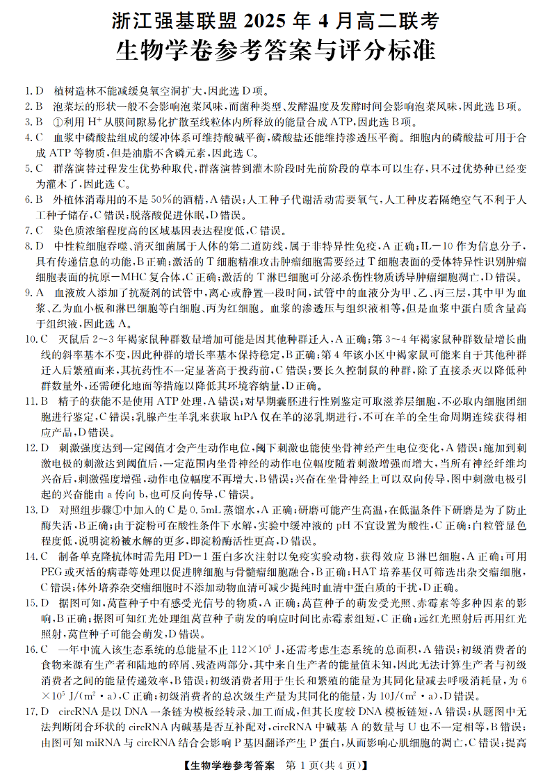 浙江强基联盟2025年高二第二学期4月联考 生物答案.pdf