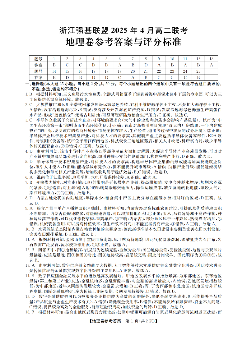 浙江强基联盟2025年高二第二学期4月联考 地理答案.pdf