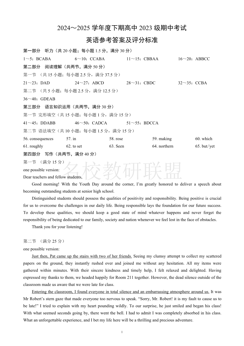 成都市蓉城联盟2024-2025学年高二下学期4月期中考试 英语答案.pdf