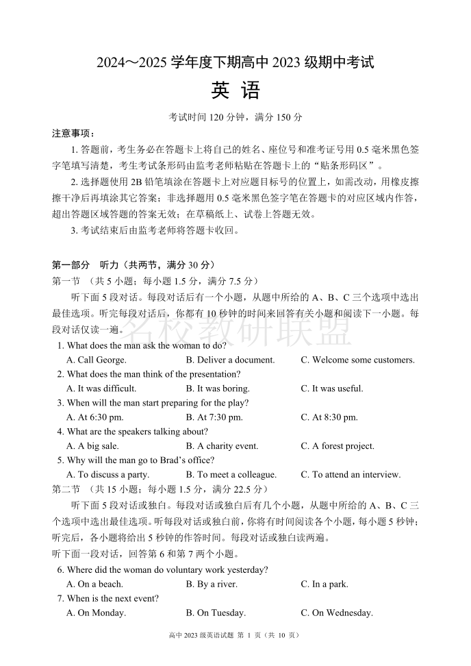 成都市蓉城联盟2024-2025学年高二下学期4月期中考试 英语.pdf