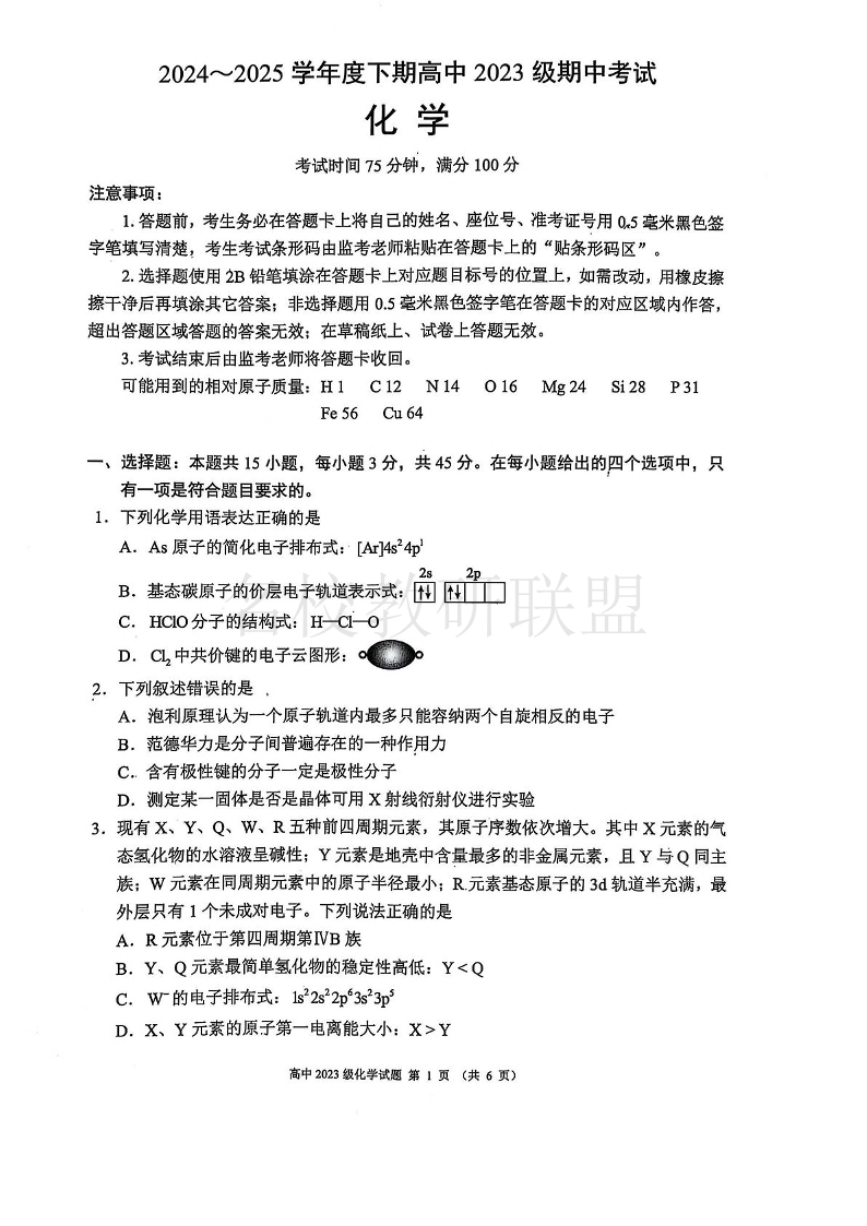 成都市蓉城联盟2024-2025学年高二下学期4月期中考试 化学.pdf