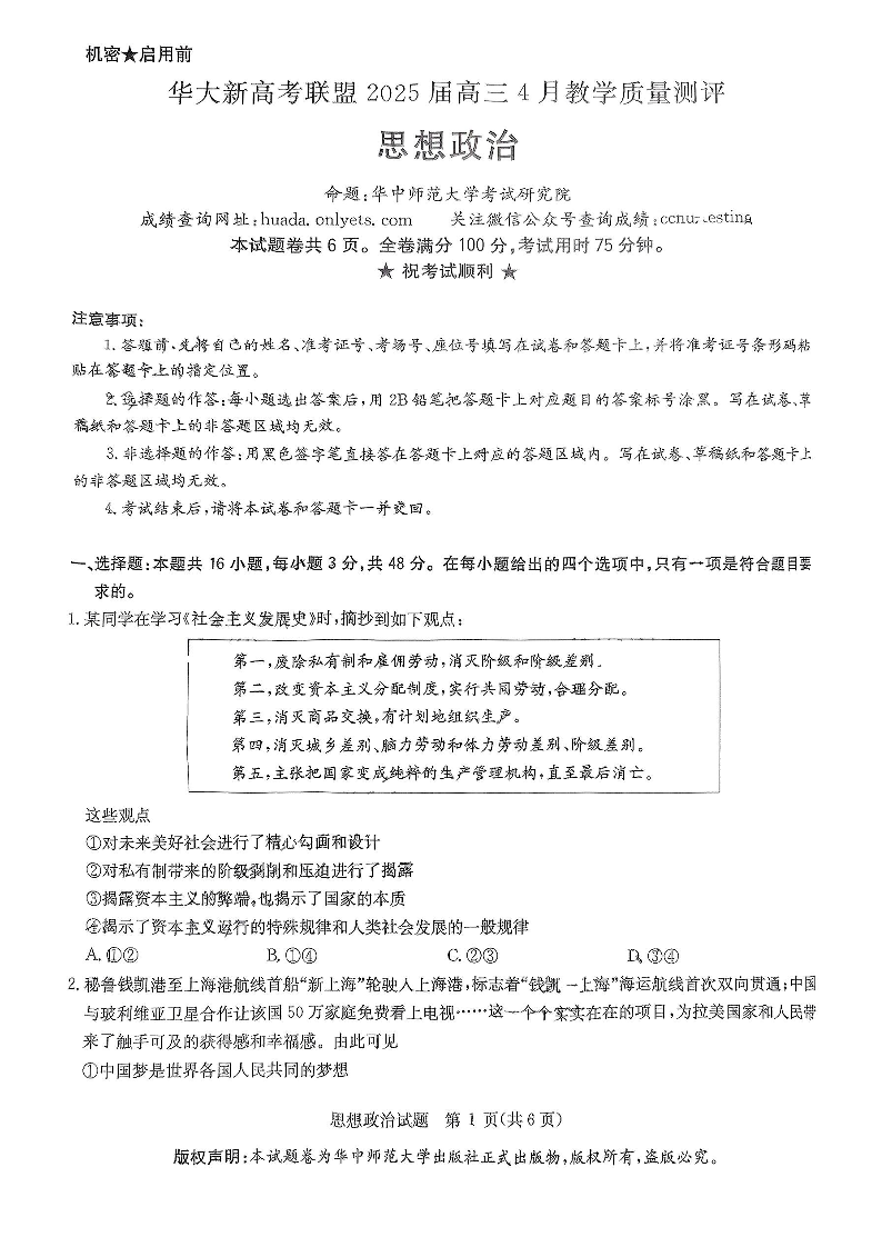 华大新高考联盟2025届高三4月教学质量测评 政治.pdf