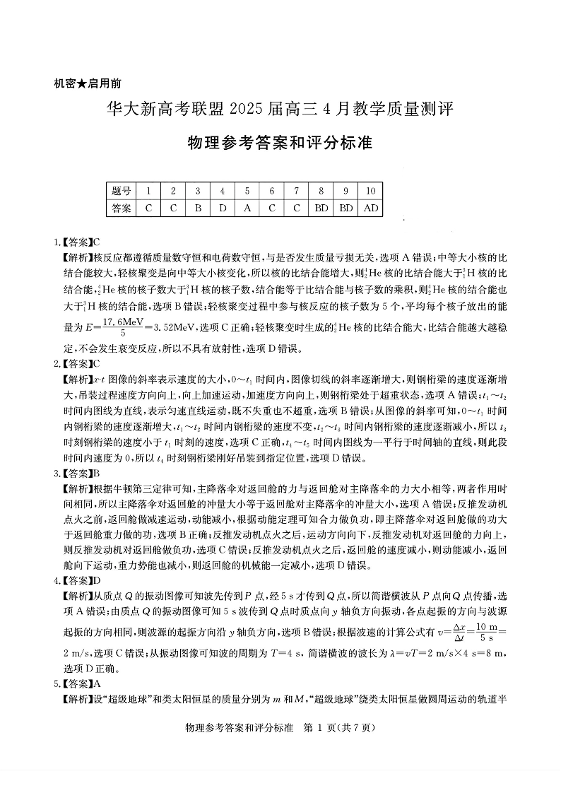 华大新高考联盟2025届高三4月教学质量测评 物理答案.pdf