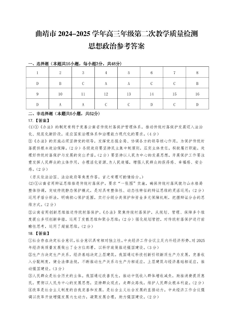 云南省曲靖市2025届高三第二次教学质量检测(曲靖二模)政治答案.pdf