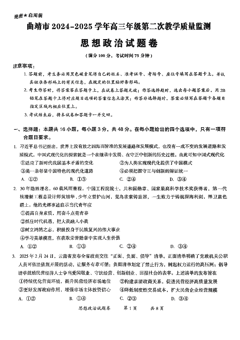 云南省曲靖市2025届高三第二次教学质量检测(曲靖二模)政治.pdf