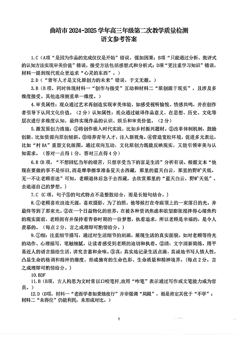 云南省曲靖市2025届高三第二次教学质量检测(曲靖二模)语文答案.pdf