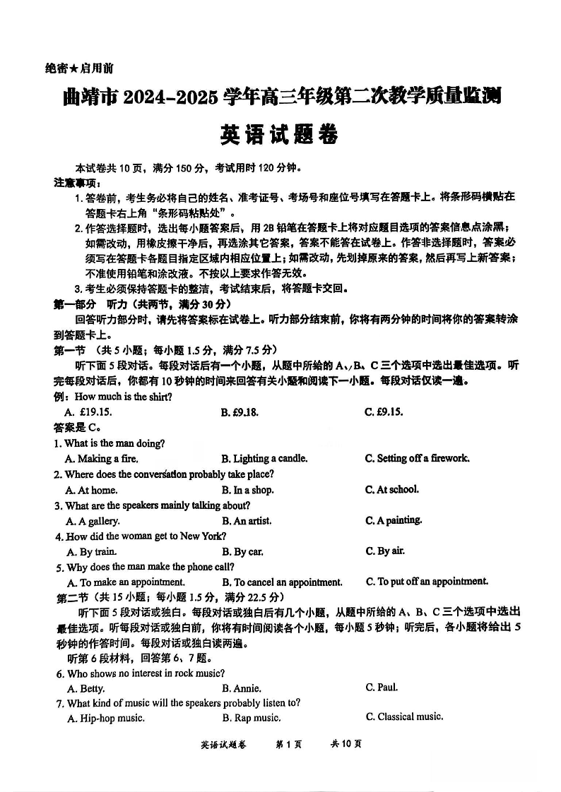 云南省曲靖市2025届高三第二次教学质量检测(曲靖二模)英语.pdf
