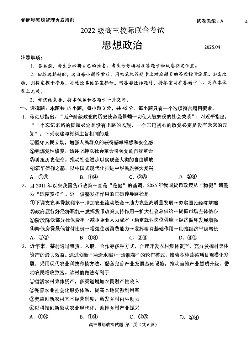 山东省日照市2025年4月高三校际联合考试 政治.pdf