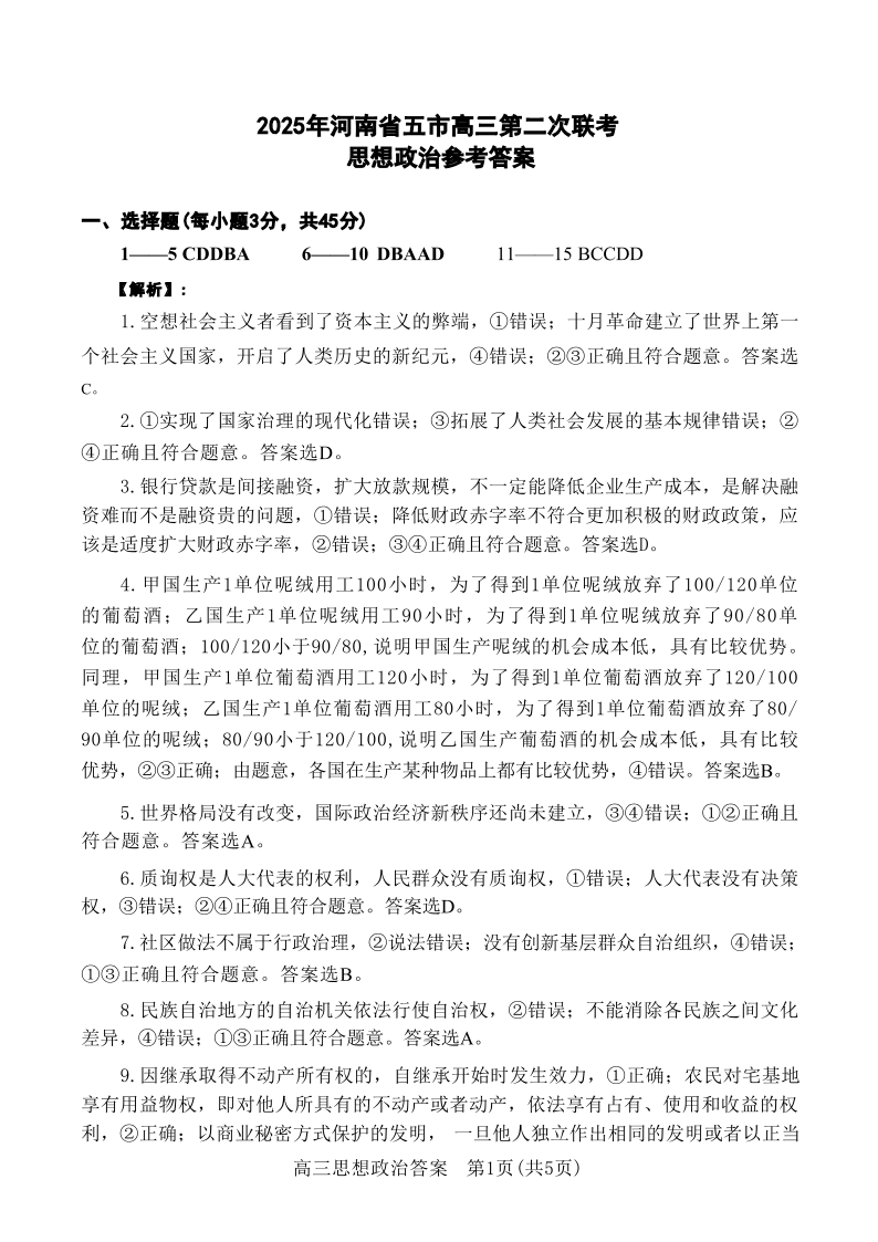 2025年河南省五市高三第二次联考 政治答案.pdf