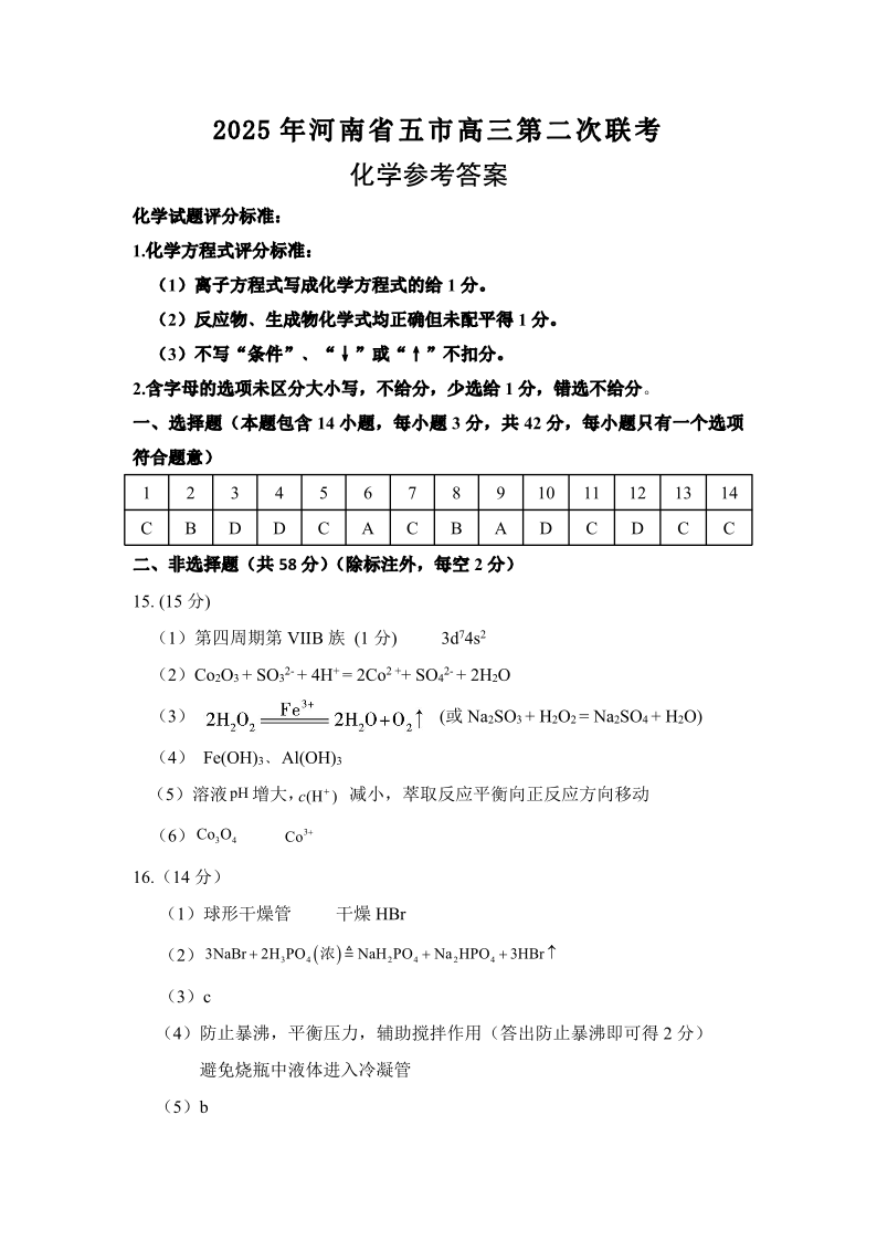 2025年河南省五市高三第二次联考 化学答案.pdf