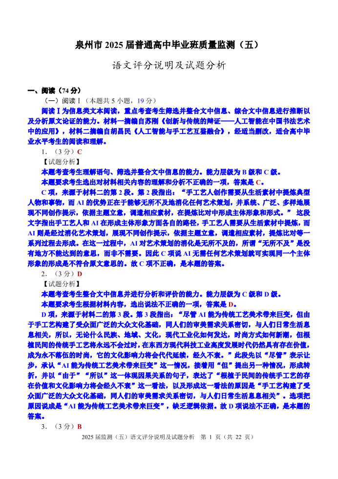 泉州市2025届高中毕业班适应性练习卷 语文答案.pdf