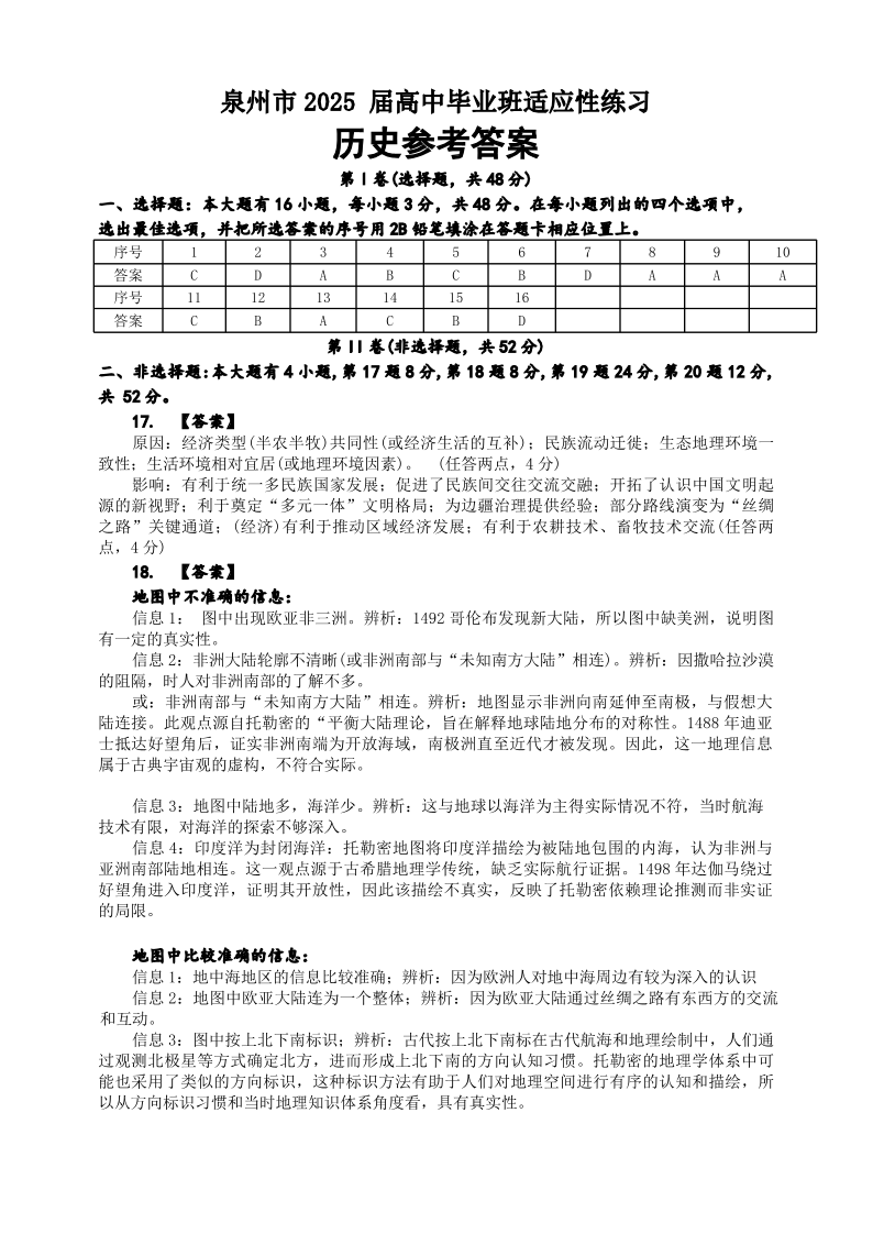 泉州市2025届高中毕业班适应性练习卷 历史答案.pdf