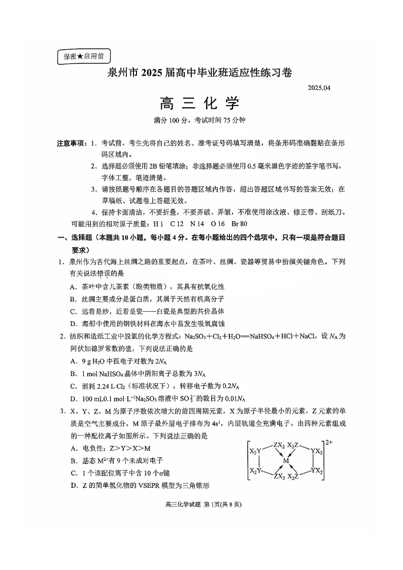 泉州市2025届高中毕业班适应性练习卷 化学.pdf
