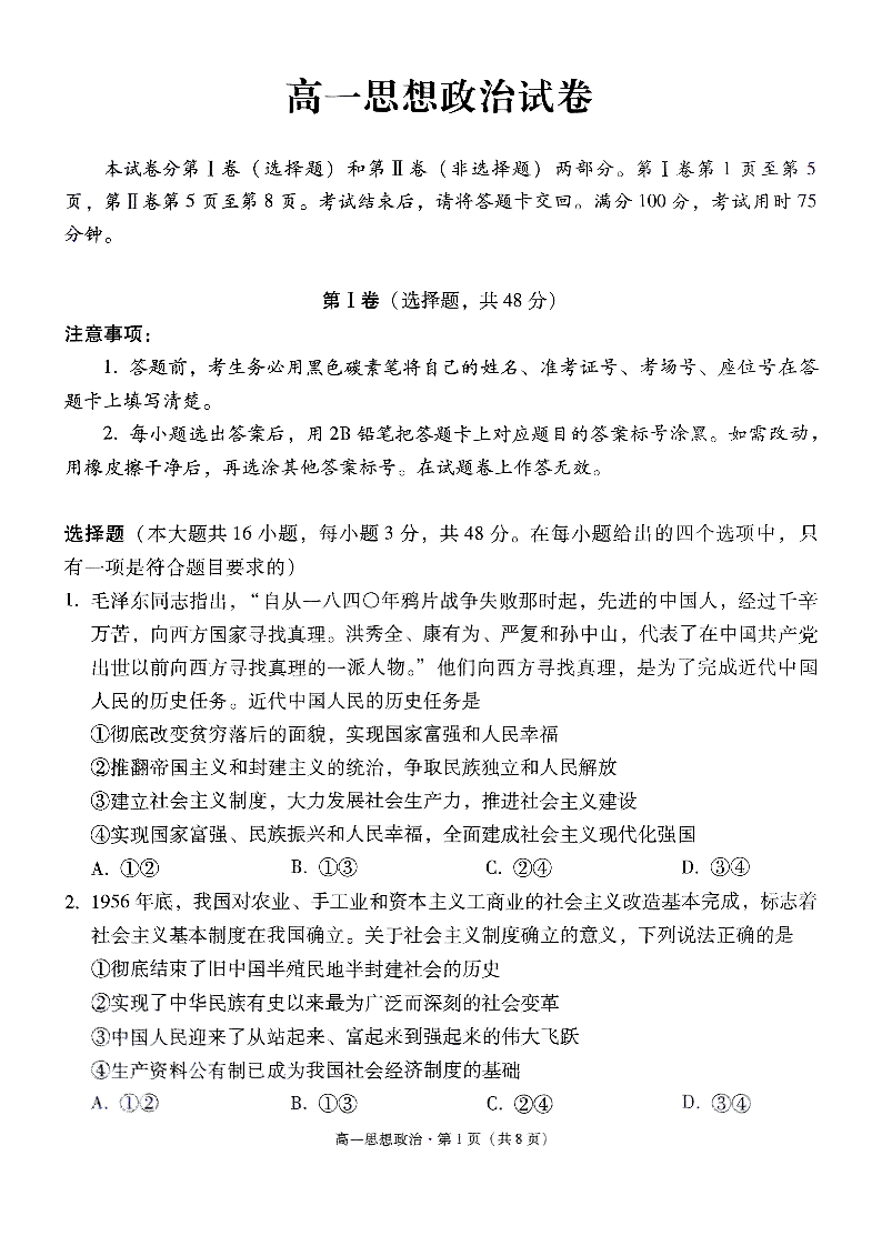 贵阳一中2024级高一年级教学质量监测卷(三)政治.pdf