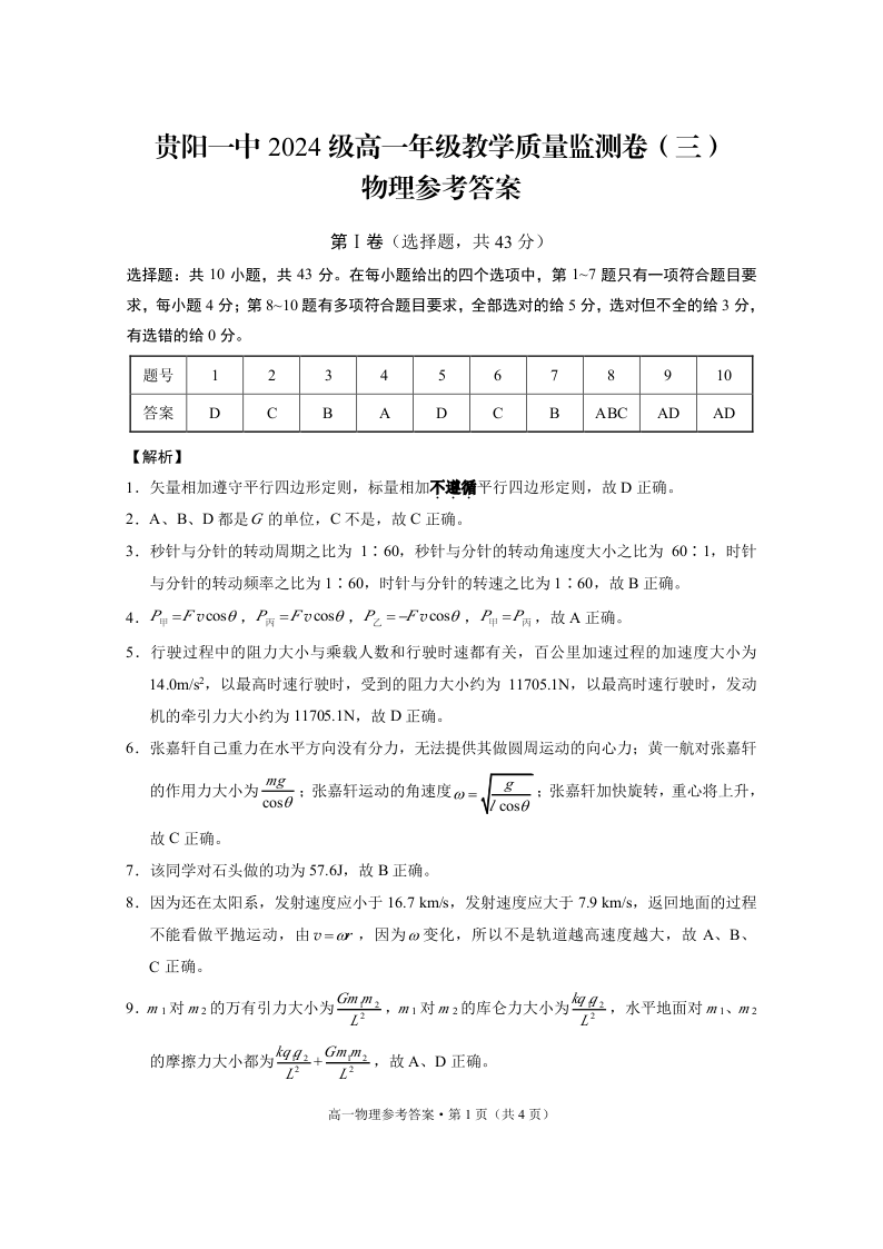 贵阳一中2024级高一年级教学质量监测卷(三)物理答案.pdf