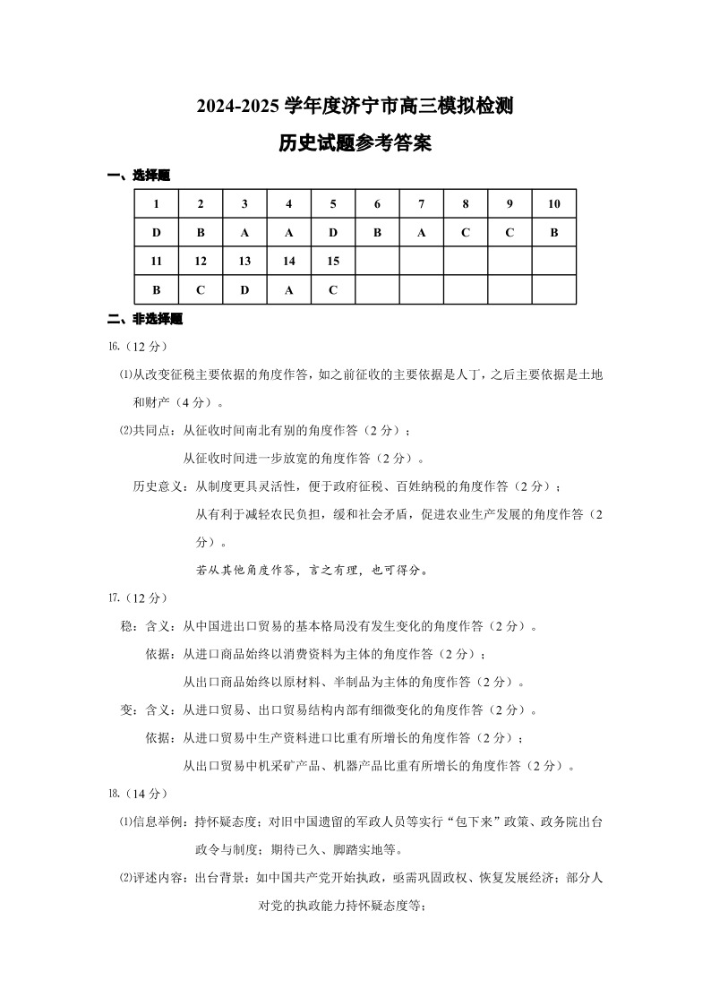 山东省(济宁市、枣庄市)高考模拟考试 历史答案.pdf
