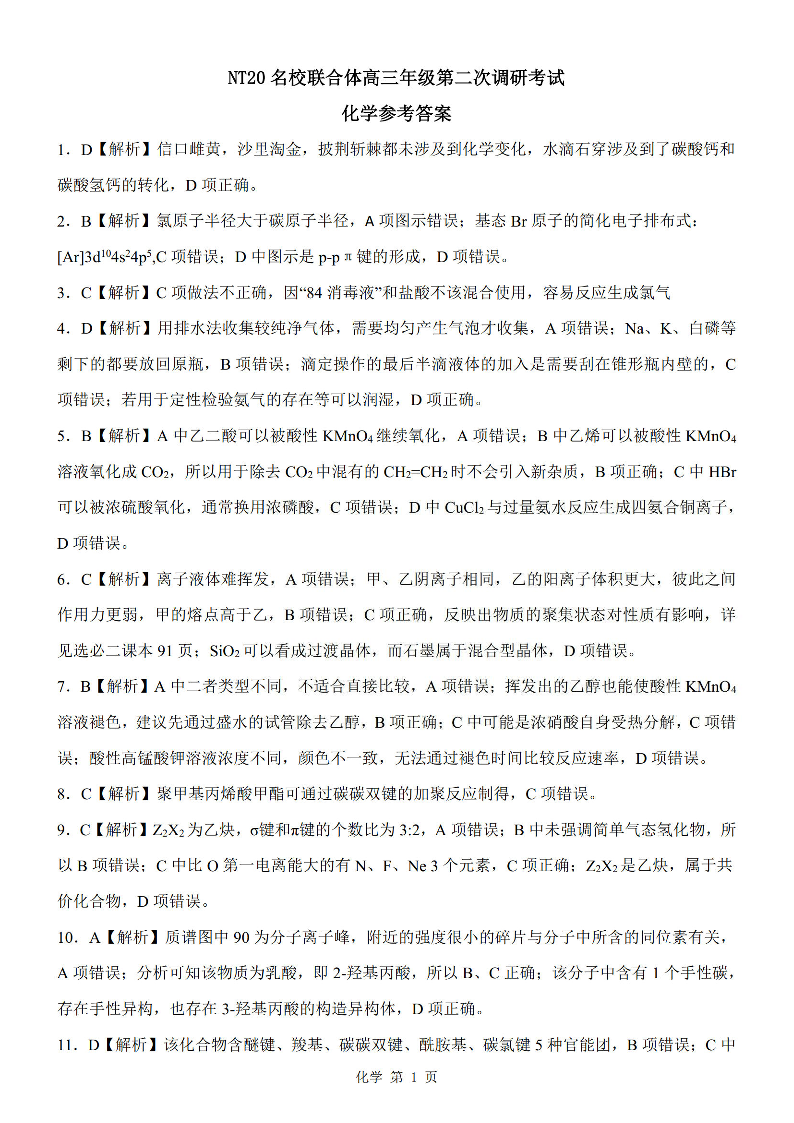 NT20名校联合体高三年级第二次调研考试 化学答案.pdf