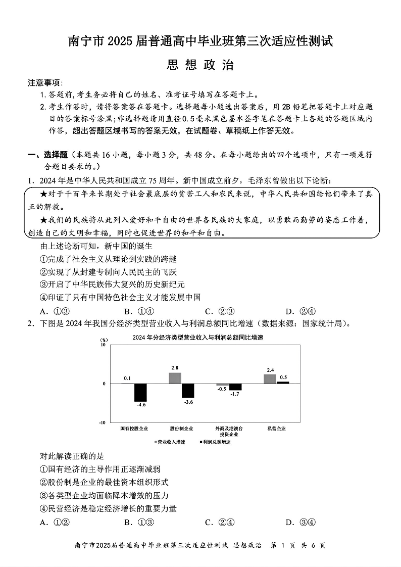 南宁市2025届普通高中毕业班第三次适应性测试 政治.pdf