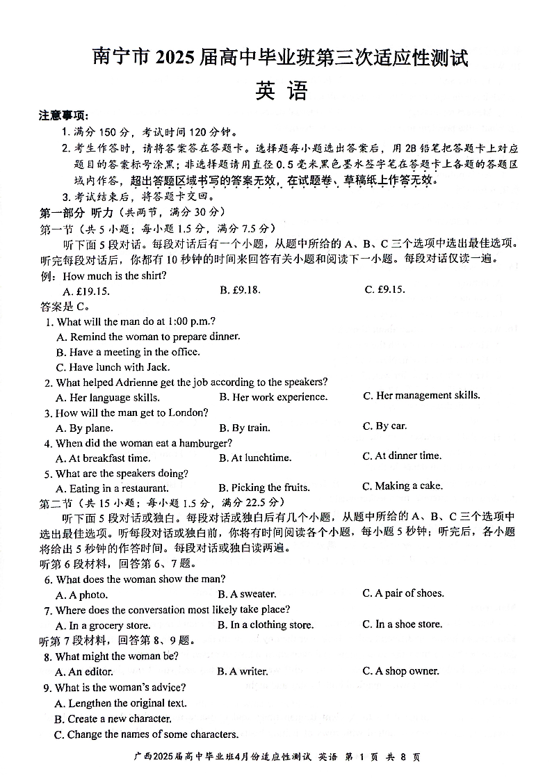 南宁市2025届普通高中毕业班第三次适应性测试 英语.pdf