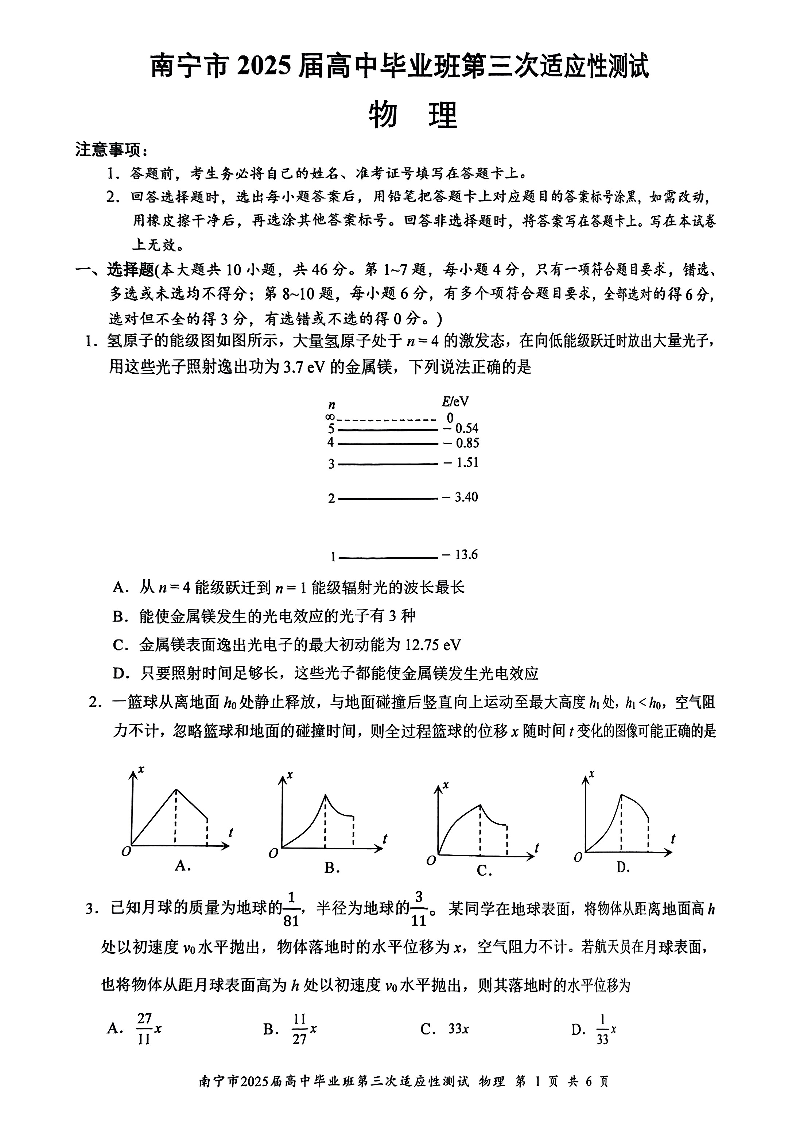 南宁市2025届普通高中毕业班第三次适应性测试 物理.pdf