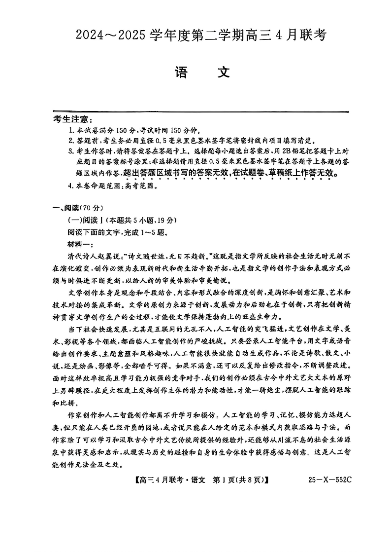 安徽省县域高中合作共享联盟2025届第二学期高三4月月考 语文(含答案).pdf