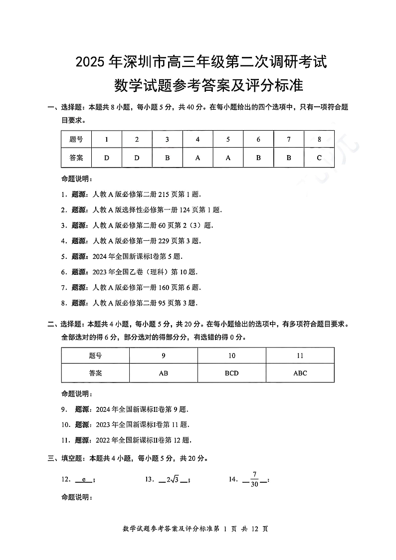 2025年深圳市高三年级第二次调研考试 数学答案.pdf
