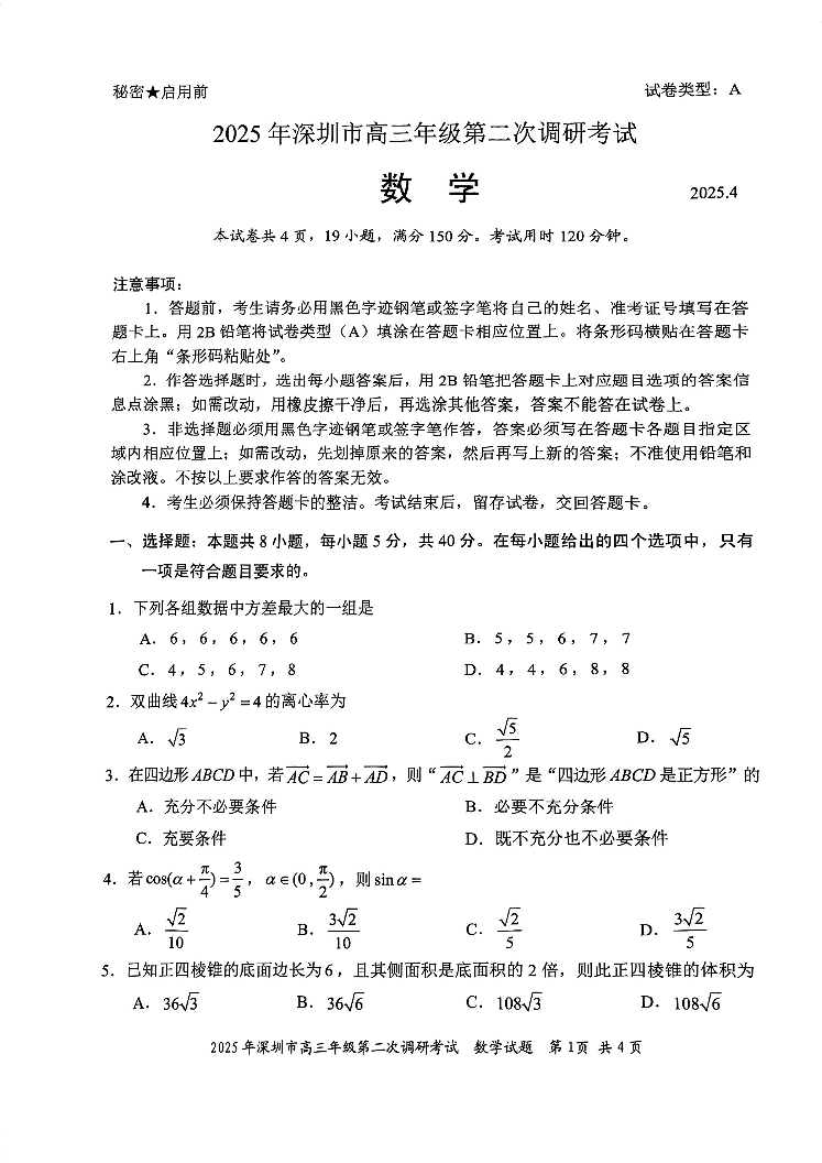 2025年深圳市高三年级第二次调研考试 数学.pdf