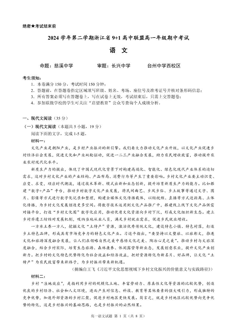 浙江省9+1联盟2024学年高一第二学期期中联考 语文.pdf