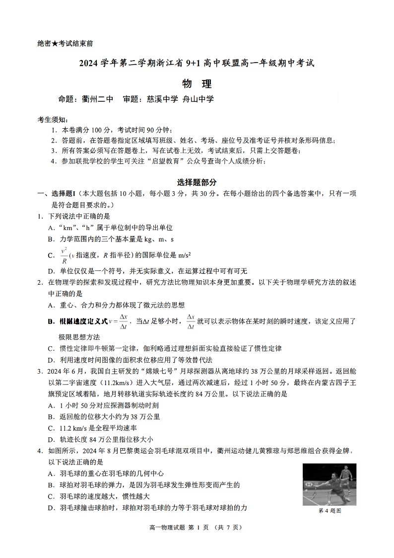 浙江省9+1联盟2024学年高一第二学期期中联考 物理.pdf