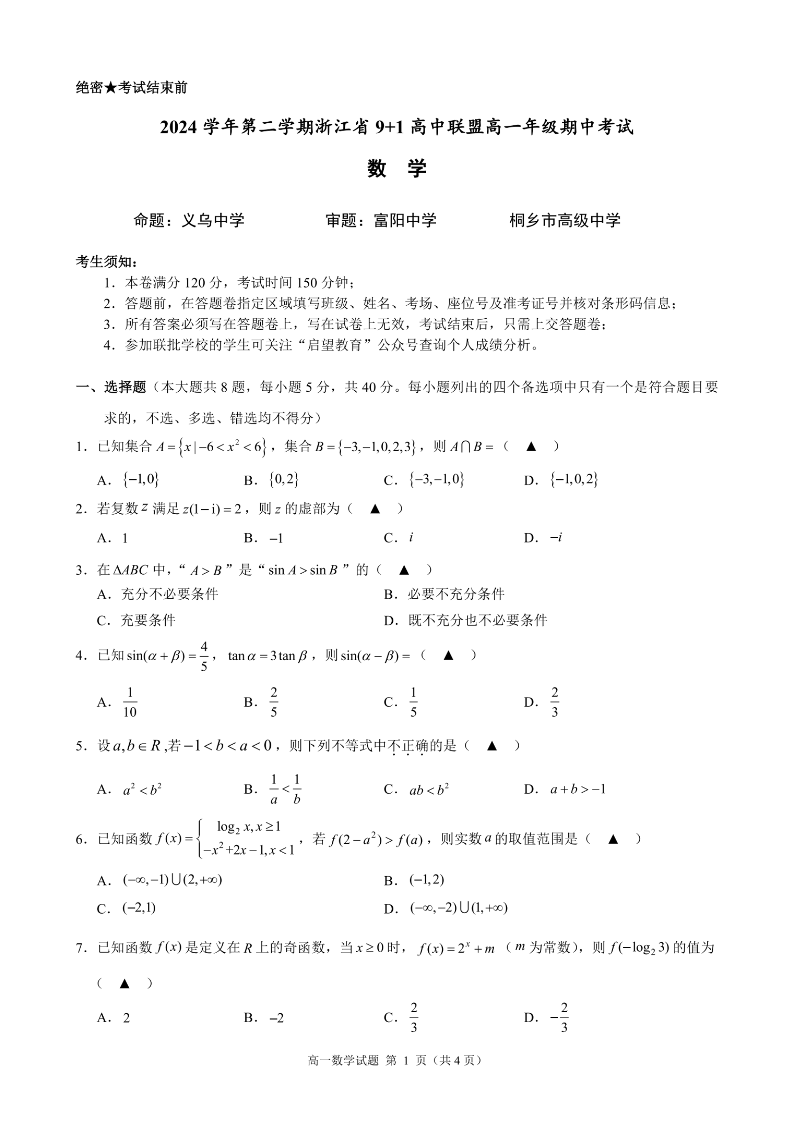 浙江省9+1联盟2024学年高一第二学期期中联考 数学.pdf