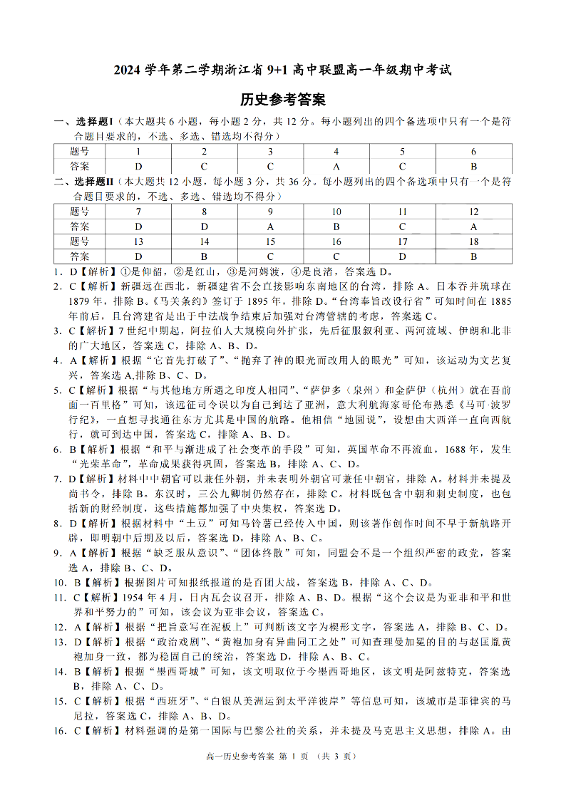 浙江省9+1联盟2024学年高一第二学期期中联考 历史答案.pdf