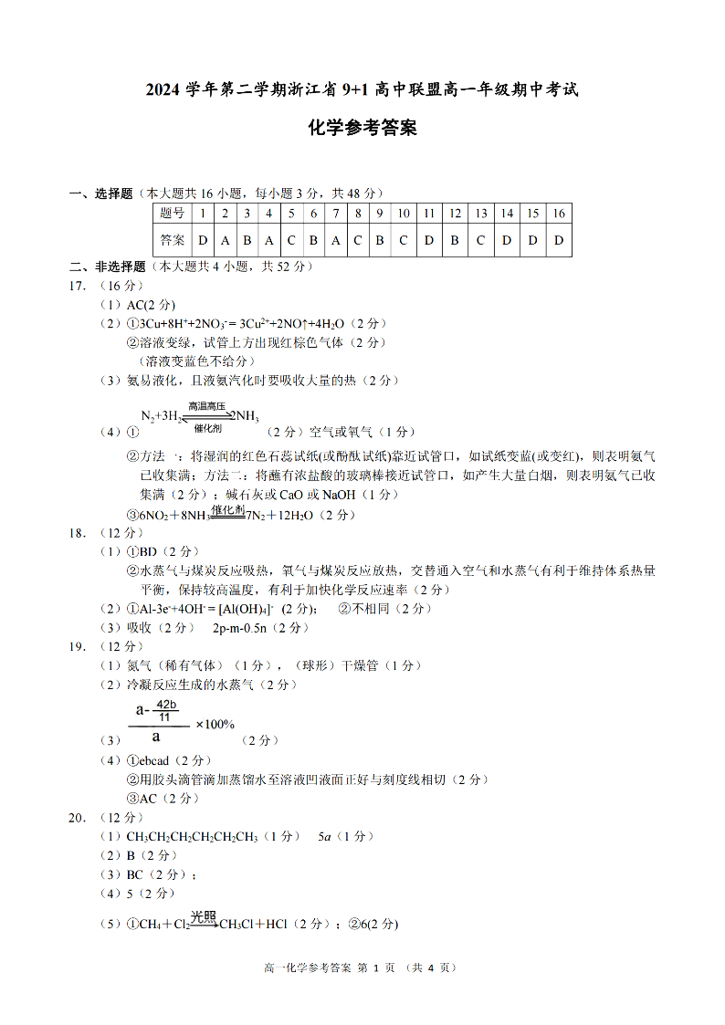 浙江省9+1联盟2024学年高一第二学期期中联考 化学答案.pdf