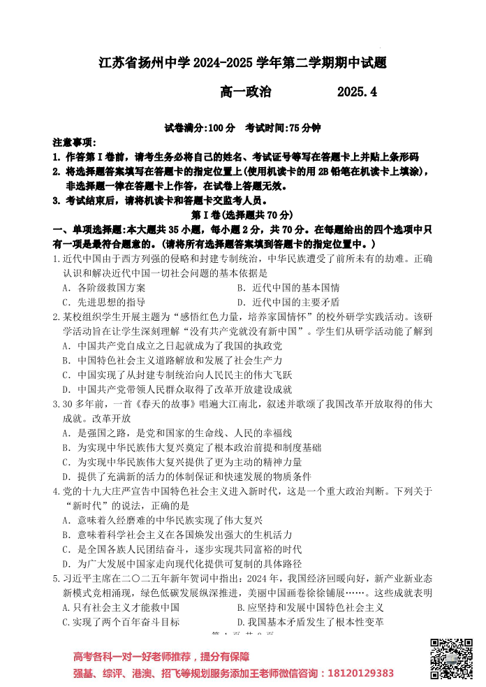 江苏省扬州中学2024-2025学年度第二学期高一期中试题 政治(含答案).pdf