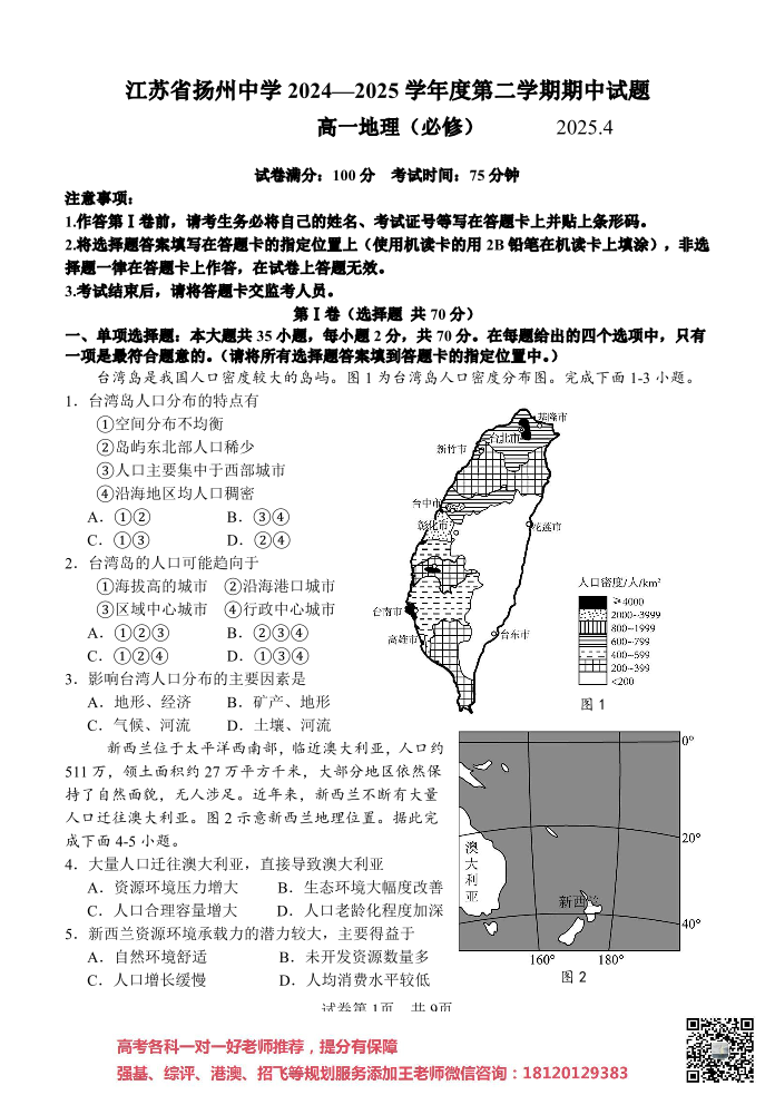 江苏省扬州中学2024-2025学年度第二学期高一期中试题 地理(含答案).pdf