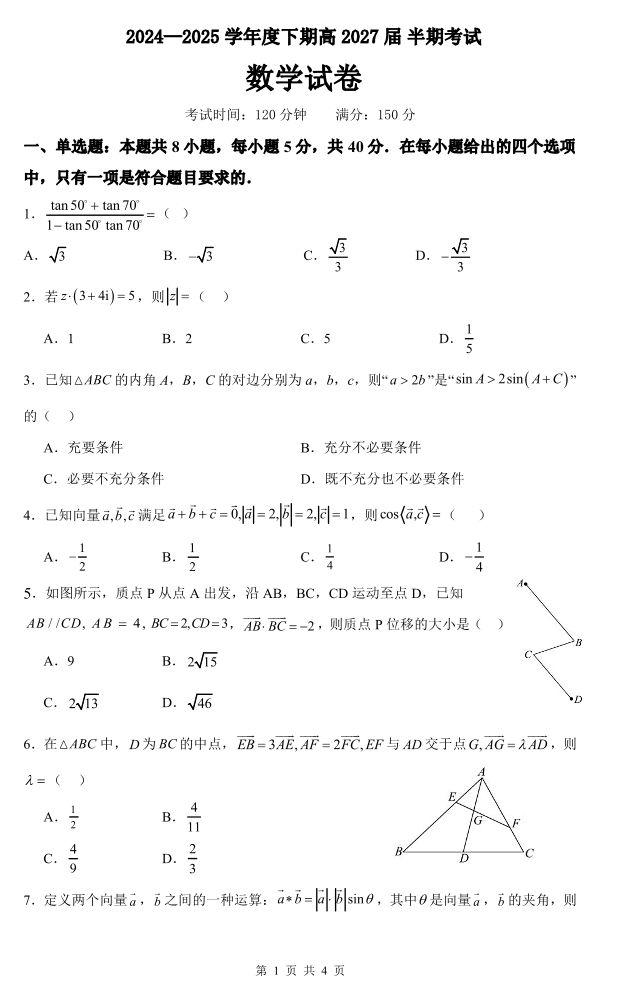 高一数学下期半期考试试卷.pdf