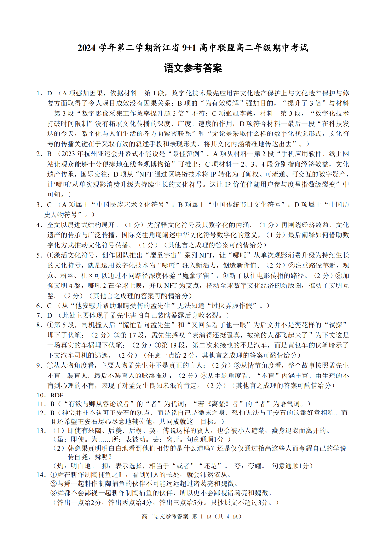 浙江省9+1联盟2024学年高二第二学期期中联考 语文答案.pdf