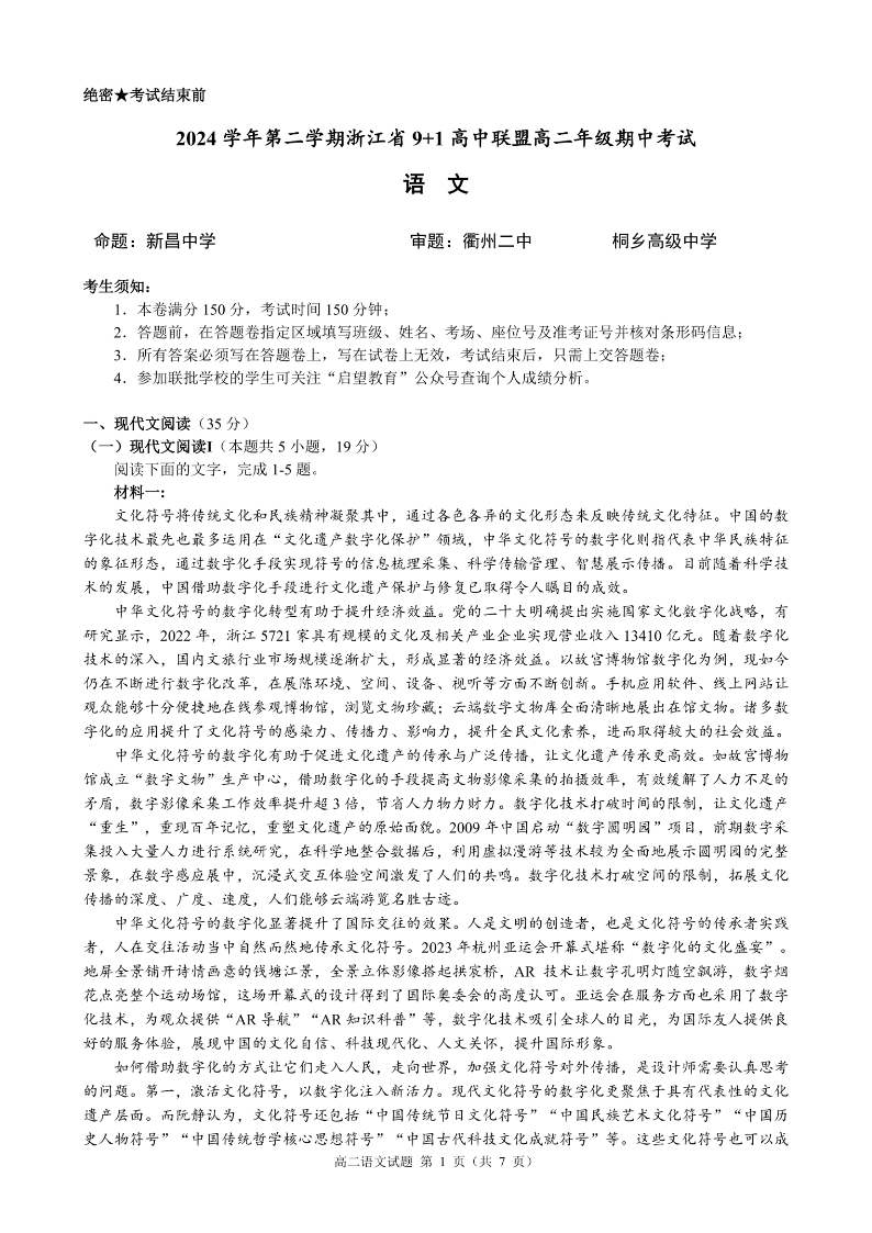 浙江省9+1联盟2024学年高二第二学期期中联考 语文.pdf