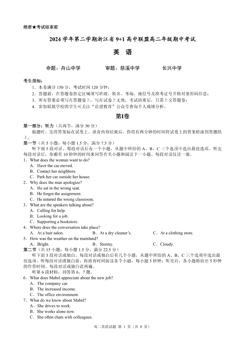 浙江省9+1联盟2024学年高二第二学期期中联考 英语.pdf