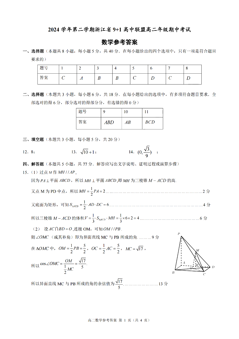 浙江省9+1联盟2024学年高二第二学期期中联考 数学答案.pdf