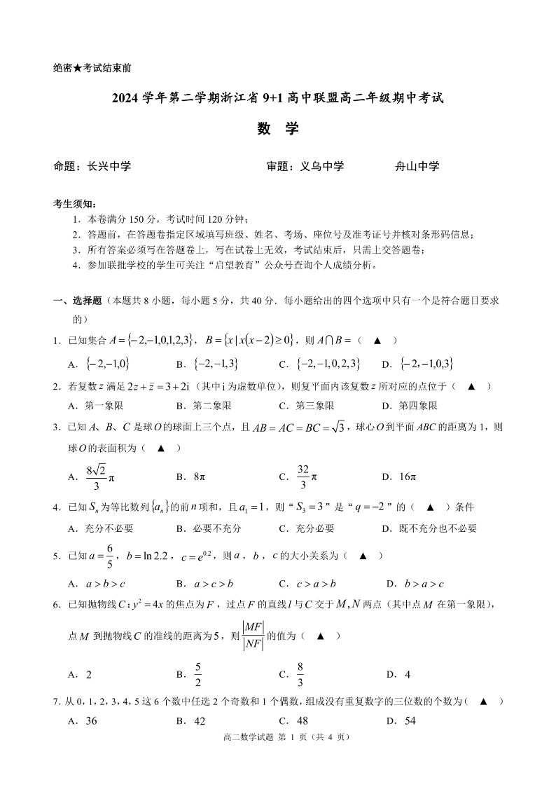 浙江省9+1联盟2024学年高二第二学期期中联考 数学.pdf